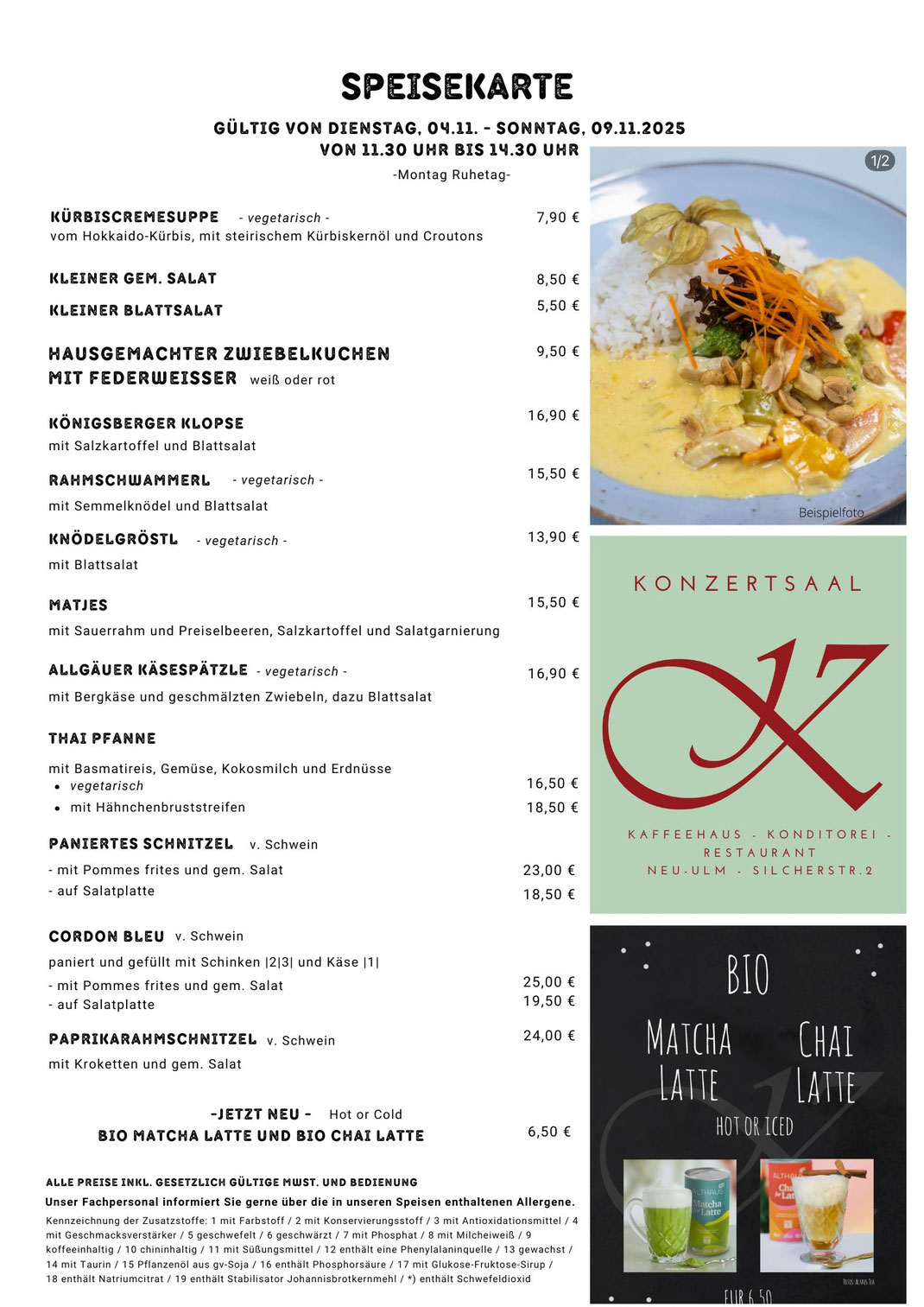 Wir bieten Ihnen eine Auswahl feiner Gerichte zum Mittagstisch vor Ort in unserem schönen Kaffeehaus mit Terrasse
